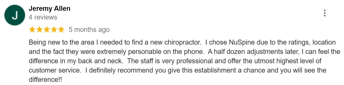 100% Secure. By Submitting, you agree to NuSpine Chiropractic's Terms of Use and Privacy Policy. You consent to receive text messages from us at the cell number provided to book your appointment and receive reminders. Message frequency depends on your activity. Reply STOP to opt-out.*New patient offers are valid for FL residents only, and proof of address must be presented upon check-in. Single visits may be purchased for $45, and walk-ins are always welcome.